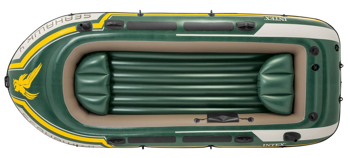 Čamac za napuhavanje za 4 osobe s 2 sjedala. Intex Seahawk 4 opremljen je aluminijskim veslima i ručnom pumpom. Ima opterećenje do 480 kg, držač za ribički štap i uže preko cijelog opsega broda. 3 zračne komore i 1 pomoćna komora sprječava iznenadno otpuštanje zraka, alat za popravak je priložen u kompletu.