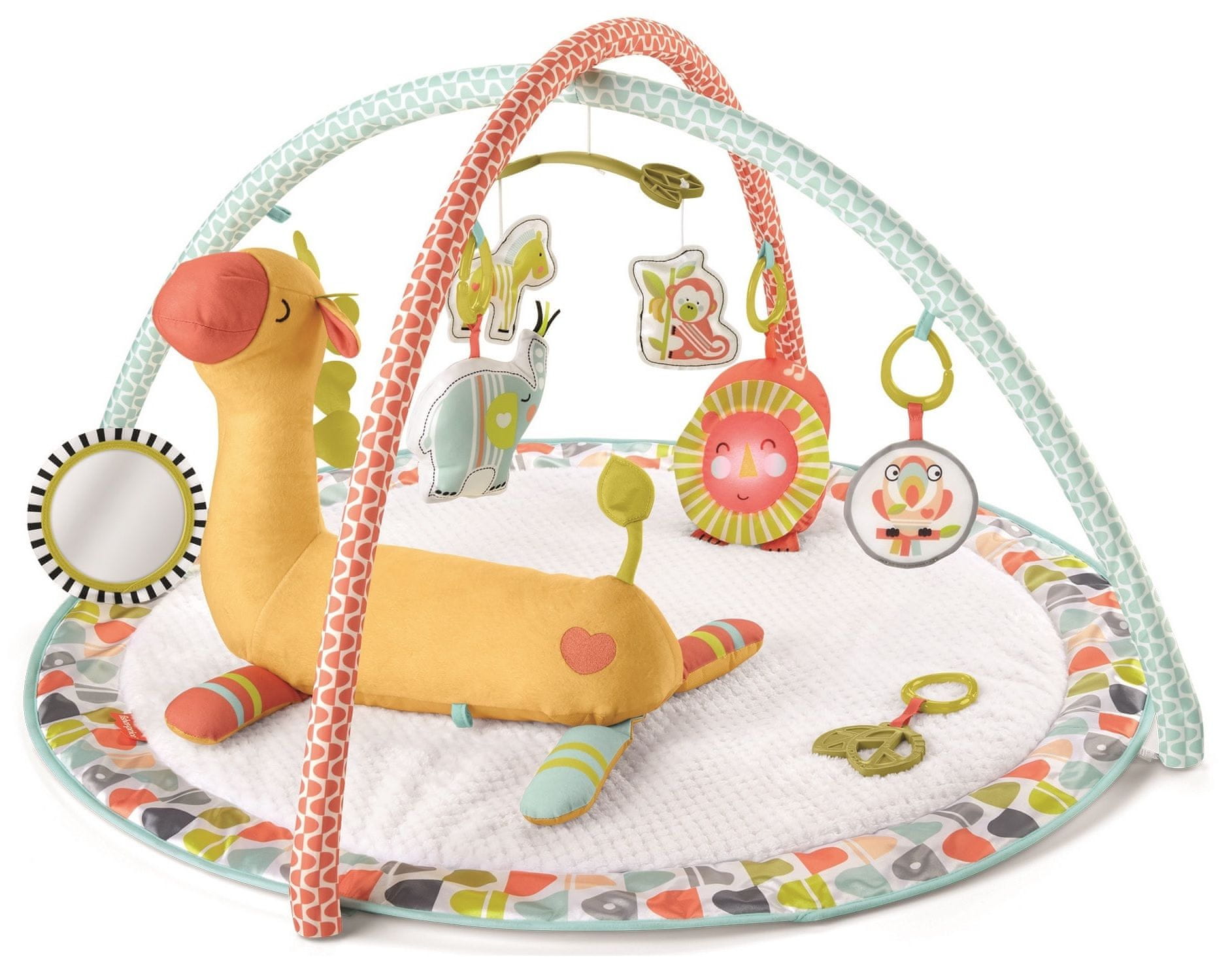 - Podlogu karakterizira vrlo velika i izuzetno ugodna prostirka za igranje, 4 igračke s aktivnostima, igračke lav i žirafa koja raste s vašim djetetom od početnog promatranja do prvog sjedenja, pa sve do prijatelja kojeg dijete uvijek i svugdje nosi sa sobom