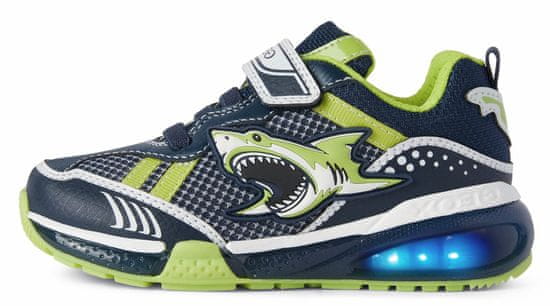 Dizajnerske tenisice za dječake sa sjajnim potplatima, brend Geox – moda koja diše. Tenisice su ukrašene motivom morskog psa i logotipom marke.