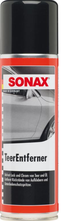 Sonax uklanjanja katrana i smole Sonax učinkovito i bez oštećenja uklanja katran, bitumen, neke smole i masne mrlje na laku i kromu. Također brzo i temeljito uklanja ostale tvrdokorne prljavštine, kao što su ostaci ljepila sa samoljepljivih ljepila, pa čak i ostatke sredstva za zaštitu podvozja (UnterbodenShutz). Budući da sredstvo sadrži vosak, površina se ponovo štiti. Zbog posebnog ventila moguće je koristiti dozu u svim položajima. |
