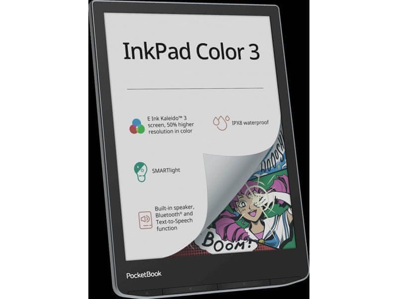 PocketBook osvježava svoju ponudu e-čitača 7,8-inčnim E Ink zaslonima u boji – novi PocketBook InkPad Color 3 ima najnoviji zaslon koji pruža još bolju rezoluciju stranica u boji. Bez obzira čitate li uzbudljiv roman, istražujete šarene stripove ili učite iz udžbenika, novi PocketBook savršeno će zadovoljiti vaše potrebe za čitanjem. Također se može pohvaliti izvanrednim skupom značajki za čitanje i slušanje: ugrađenim zvučnikom, funkcijom pretvaranja teksta u govor, Bluetoothom, vodootpornošću IPX8, SMARTlightom, tamnim načinom rada, podrškom za 25 formata bez pretvorbe itd.
