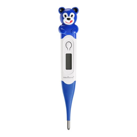 Mediblink digitalni termometar Medved M376 je visokokvalitetan i vodootporan uređaj s fleksibilnim vrhom, pogodan za cijelu obitelj (oralno, rektalno, ispod pazuha). Zbog svog slatkog oblika i boja, posebno je privlačan djeci. Vrijeme mjerenja je 60 sekundi, termometar sprema posljednju vrijednost i oglašava se alarmom kada temperatura poraste.