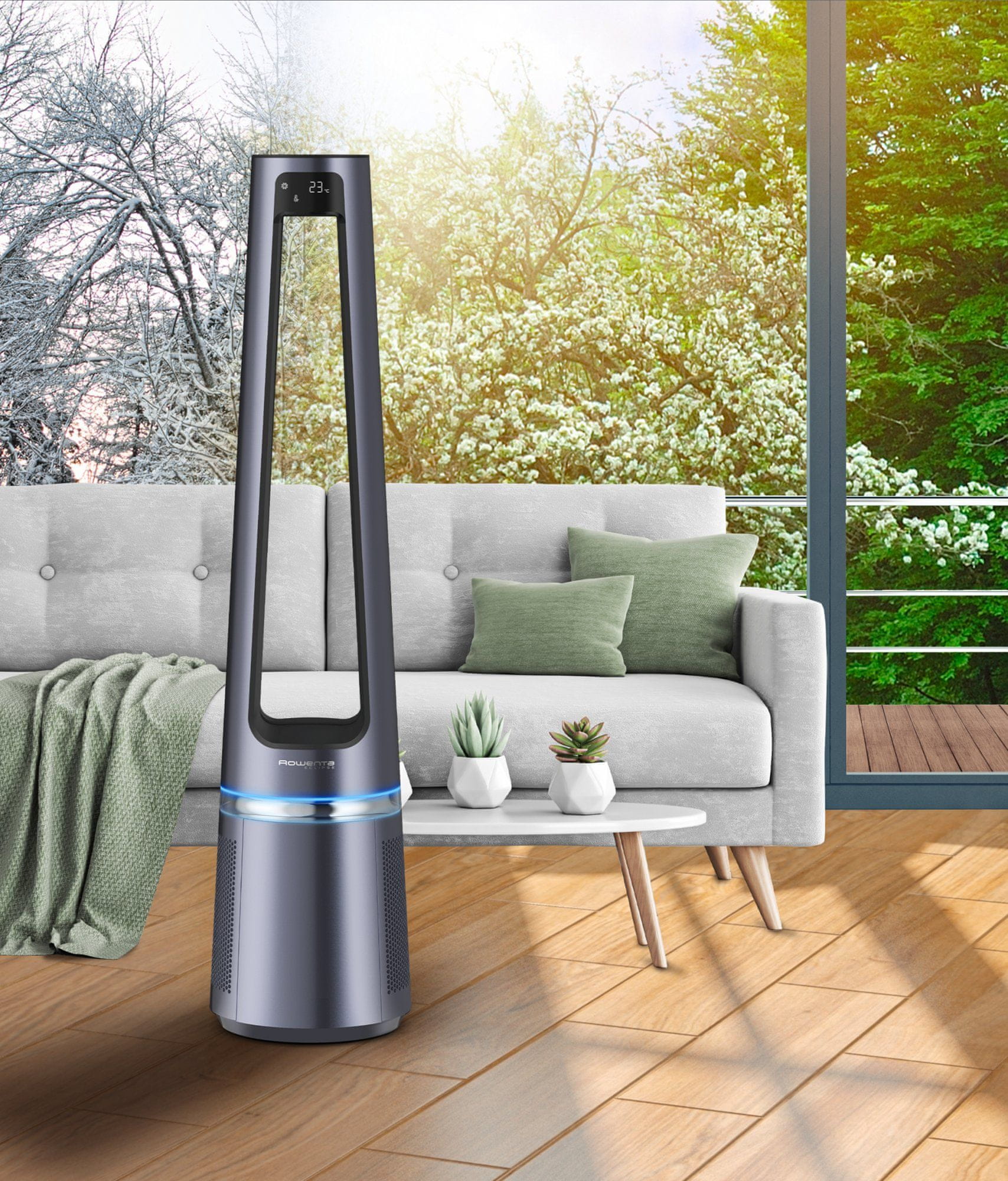 Dizajn 2 u 1 nudi izvrsno pročišćavanje zraka zahvaljujući dva filtra velike gustoće, koji hvataju do 99,95% nečistoće, a pružaju intenzivno osvježenje. Moćan ventilator optimalno pokriva cijelu sobu – do 8 metara.