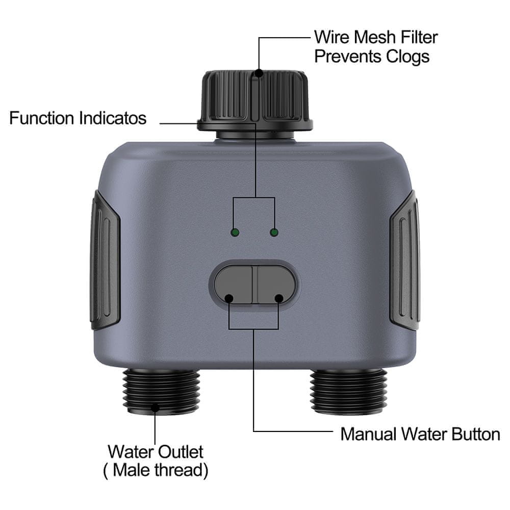 Navodnjavanje se može postaviti s preciznošću na minute, uz učestalost od 1–24 sata ili cikluse u rasponu od 1 do 7 dana. Funkcija Rain Delay omogućuje odgodu navodnjavanja do 7 dana, što pomaže uštedi vode tijekom kišnih dana. Zahvaljujući glasovnom upravljanju putem Google Home i Amazon Echo, ventil možete kontrolirati i bez potrebe za korištenjem telefona.