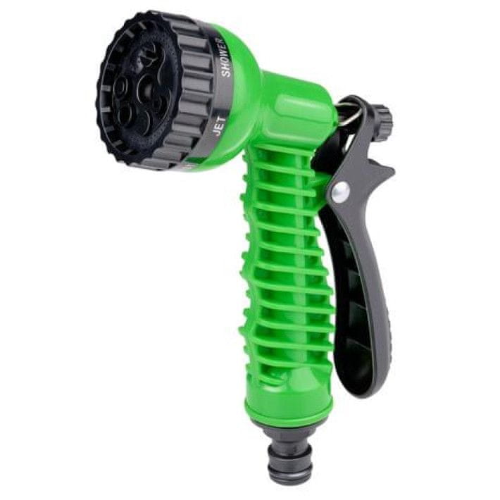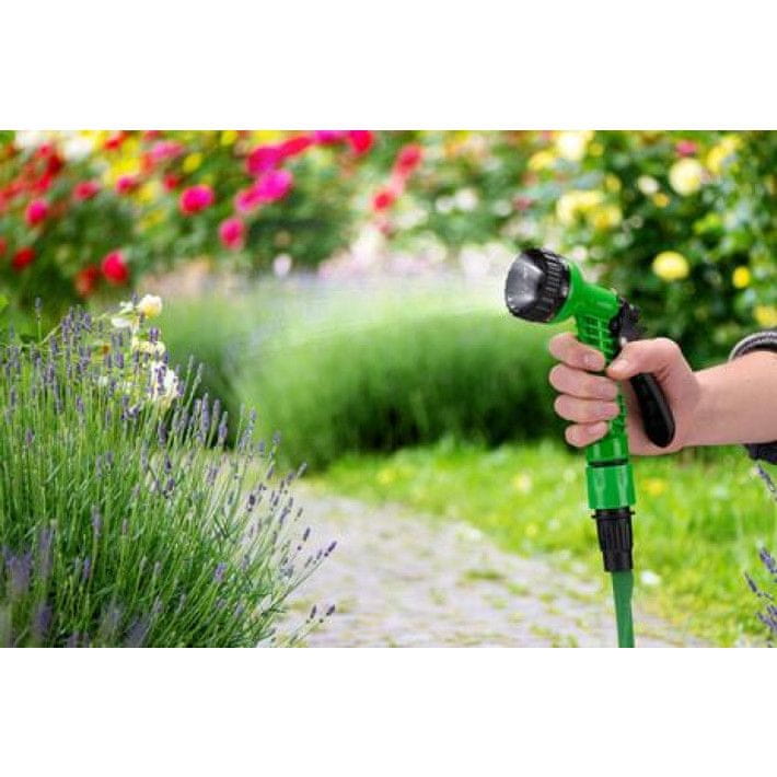 Ovaj fleksibilni set vrtnih crijeva s nastavkom idealan je za održavanje i zalijevanje vašeg vrta. Set dolazi sa savitljivim vrtnim crijevom. Duljine je 7,5 metara i može se produžiti do maksimalno 15 metara. To vam daje više slobode kretanja od tradicionalnog vrtnog crijeva. To također znači da vrtno crijevo zauzima manje prostora kada se ne koristi. Na kraju se pričvrsti glava za prskanje i spojni dio. Glava za prskanje ima 7 postavki prskanja, od tvrdog vodenog mlaza do meke magle.