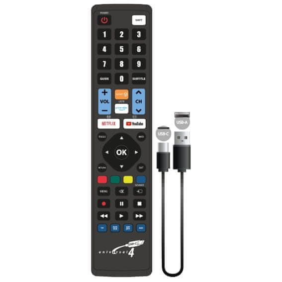 Daljinski omogućuje kontrolu svih funkcija uređaja, uključujući izbornik (Menu), AV odabir, teletekst i tipke u boji. Programiranje se vrši putem USB-C kabela koji je uključen u pakiranje, što olakšava brzo i jednostavno podešavanje.