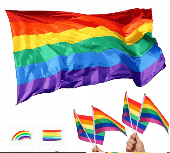 Nikcorp LGBTQ zastava duginih boja 150x90 cm, izdržljivi poliester za vanjsku upotrebu, set s malom zastavicom i tetovažama
