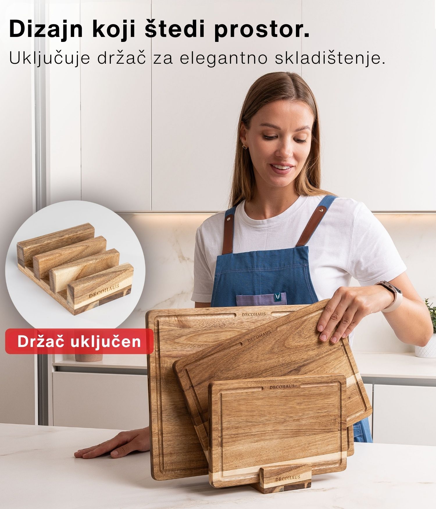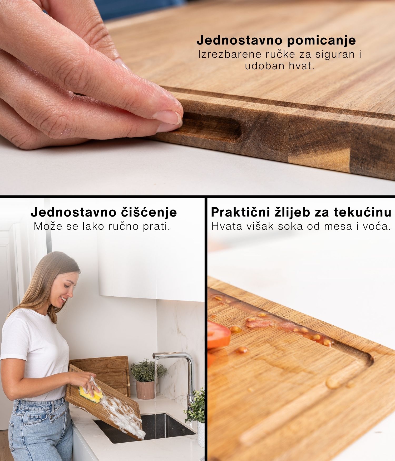 - Set dasaka za rezanje od akacijevog drva – Visokokvalitetno, antibakterijsko akacijevo drvo osigurava da su naše daske za rezanje izdržljive, prikladne za nož i elegantne u svakoj kuhinji.