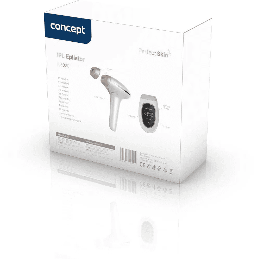 Concept IL3020 Perfect Skin je kućni IPL epilator koji koristi tehnologiju intenzivnog pulsnog svjetla, potvrđenu s više od 15 godina kliničkih testiranja, i omogućuje postupno smanjenje rasta dlačica na tijelu i osjetljivim područjima. Nudi 2 režima tretmana i 5 razina intenziteta kako bi odgovarao što većem broju tonova kože. U pakiranju se nalaze 2 izmjenjiva nastavka za noge, ruke ili leđa te za osjetljiva područja poput pazuha, bikini linije ili lica. Sigurnost povećava senzor zaštite očiju koji sprječava neželjeni bljesak izvan kontakta s kožom.