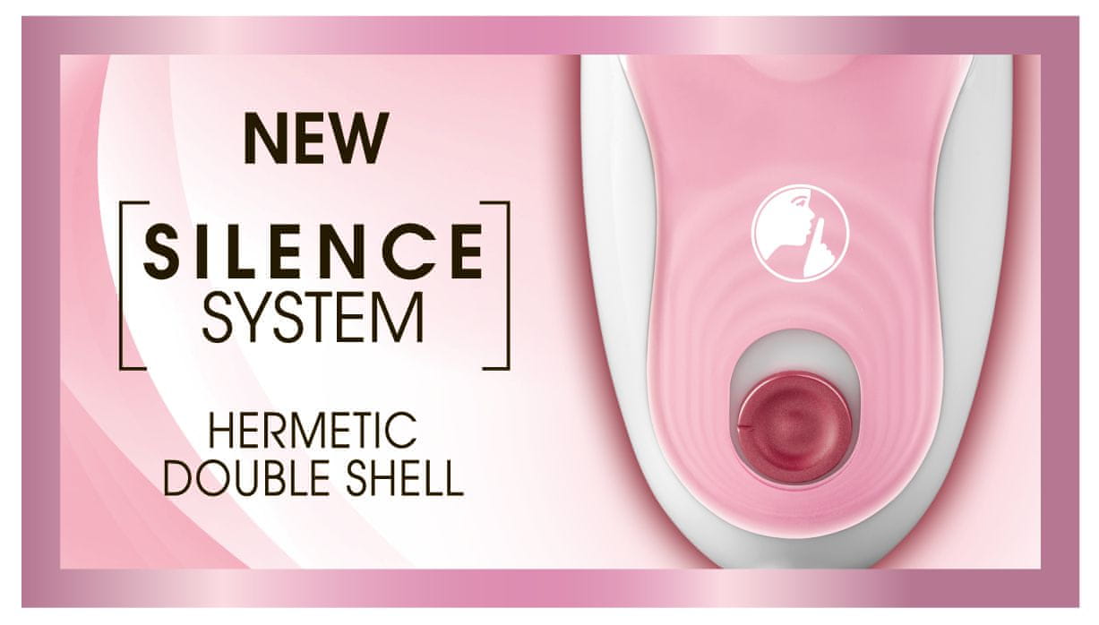Epilator Rowenta Silence Soft ima tehnologiju Silence, koja u kombinaciji s hermetički zatvorenim dvostrukim kućištem učinkovito prigušuje buku.