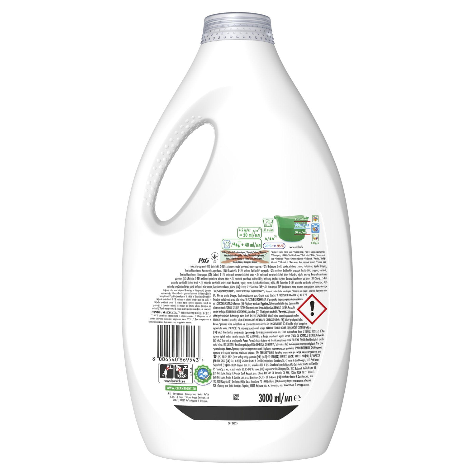 Ariel Sensitive Washing Gel uklanja tvrdokorne mrlje s rublja, a pritom je nježan i ugodan za kožu. Učinkovit je i pri niskim temperaturama. Uključuje 0 % bojila i manje alergena. Dermatološki ispitano i neprofitno certificirano