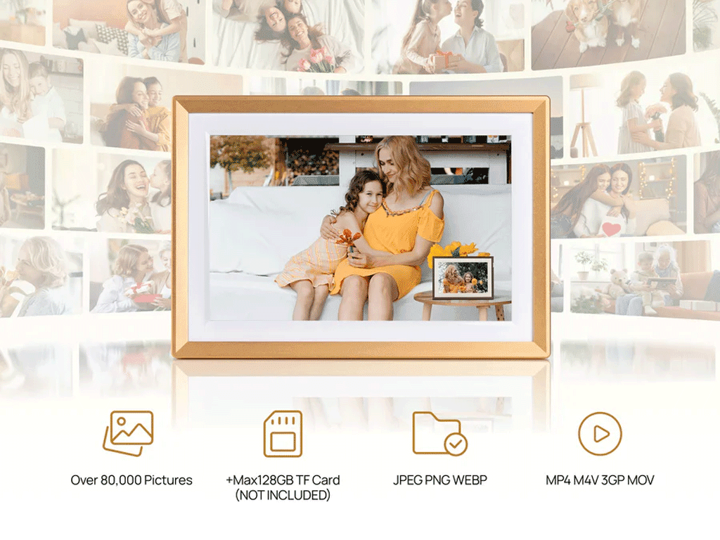 Arzopa digitalni okvir za fotografije olakšava dijeljenje fotografija izravno s vašeg pametnog telefona putem namjenske aplikacije kompatibilne s iOS i Android uređajima. S ugrađenim Wi-Fi -jem možete slati svoje omiljene trenutke u okvir s bilo kojeg mjesta, a slike će se pohranjivati u ugrađenu memoriju od 32 GB ili u oblaku. Za još veću fleksibilnost, uređaj podržava proširenje SD kartice do 128 GB, pružajući prostor za tisuće nezaboravnih uspomena.