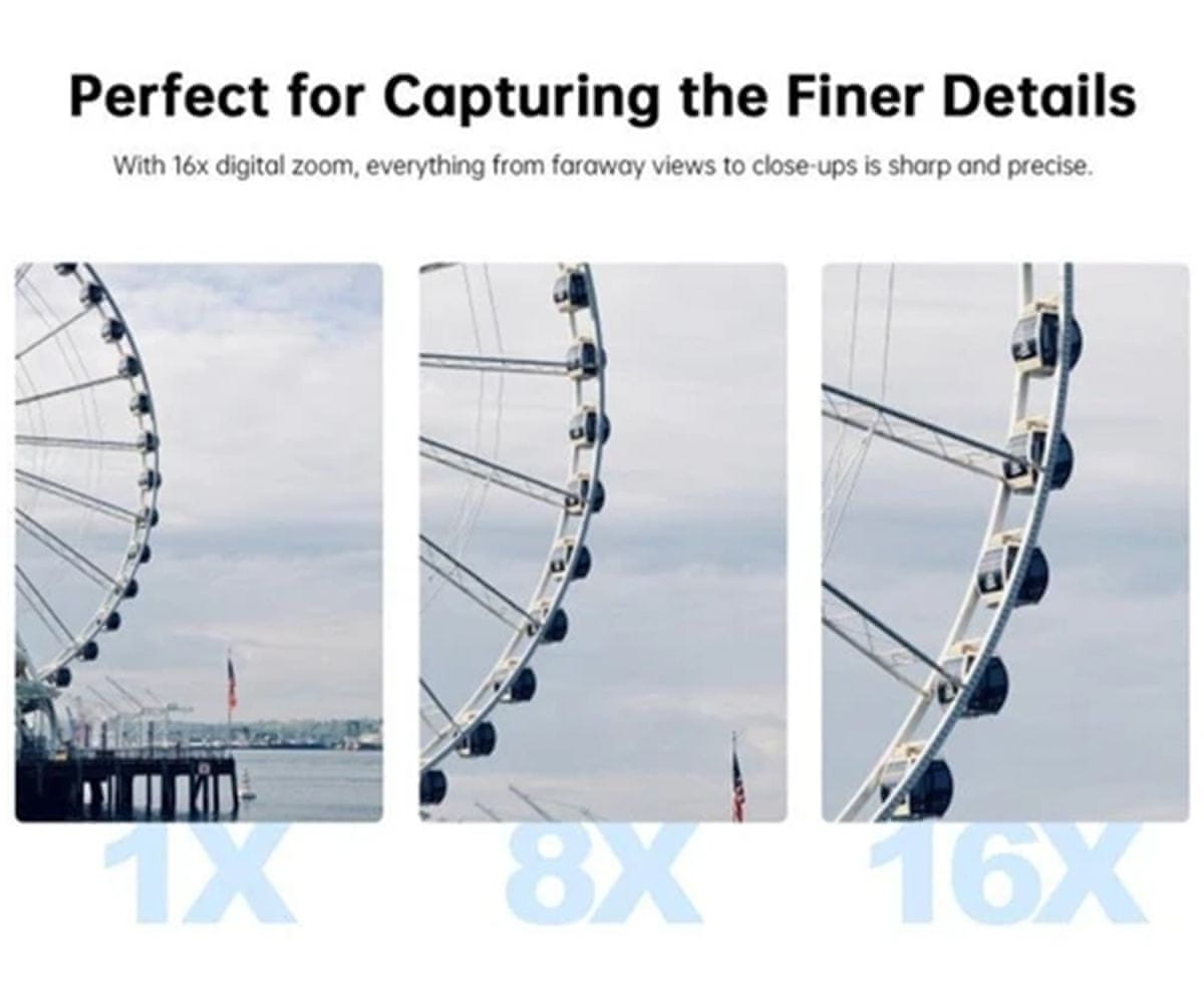 Približite se svojim subjektima uz 16× digitalni zum . Omogućuje vam precizno snimanje udaljenih detalja, bilo da fotografirate divlje životinje, pejzaže ili događaje iz daljine.