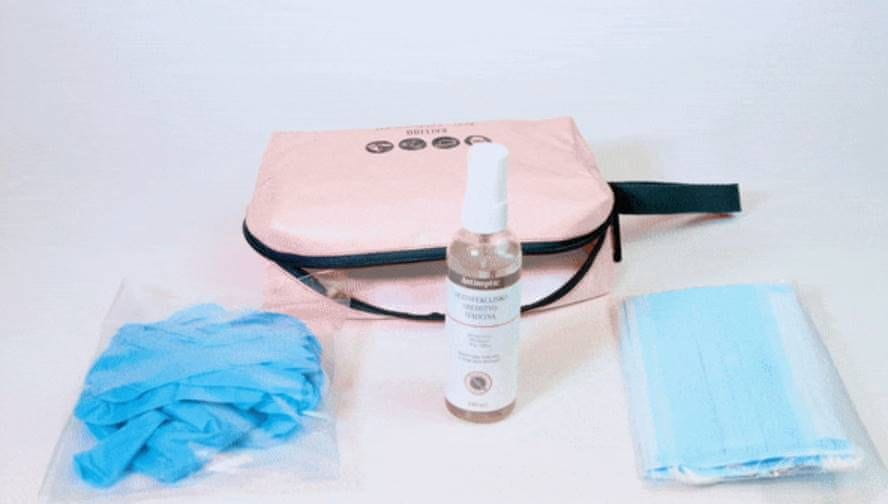 Set, pohranjen u ružičastoj torbici, sadrži sredstvo za dezinfekciju ruku, pet higijenskih maski i tri para zaštitnih rukavica.