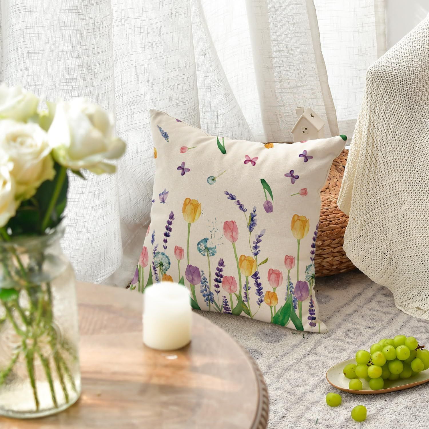 Nikcorp Uskrsna jastučnica s motivom tulipana, lavande i leptira, bež, 45x45 cm, dekorativna navlaka od poliestera bez punjenja