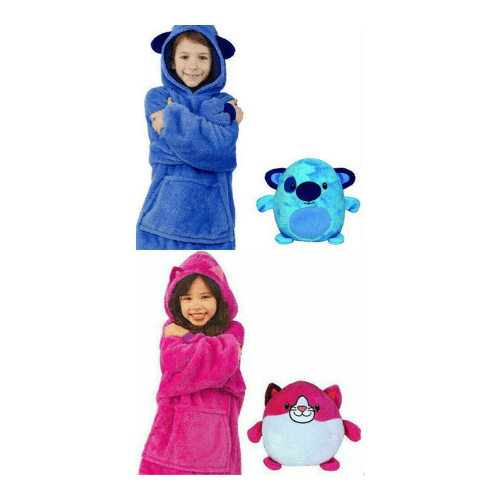 Netscroll 3u1 plišana igračka, jastuk i dječji hoodie s kapuljačom, Maks i Maša, topli pulover koji se pretvara u udoban jastučić, univerzalna veličina za djecu 3–10 godina, KidsHoodie, plava