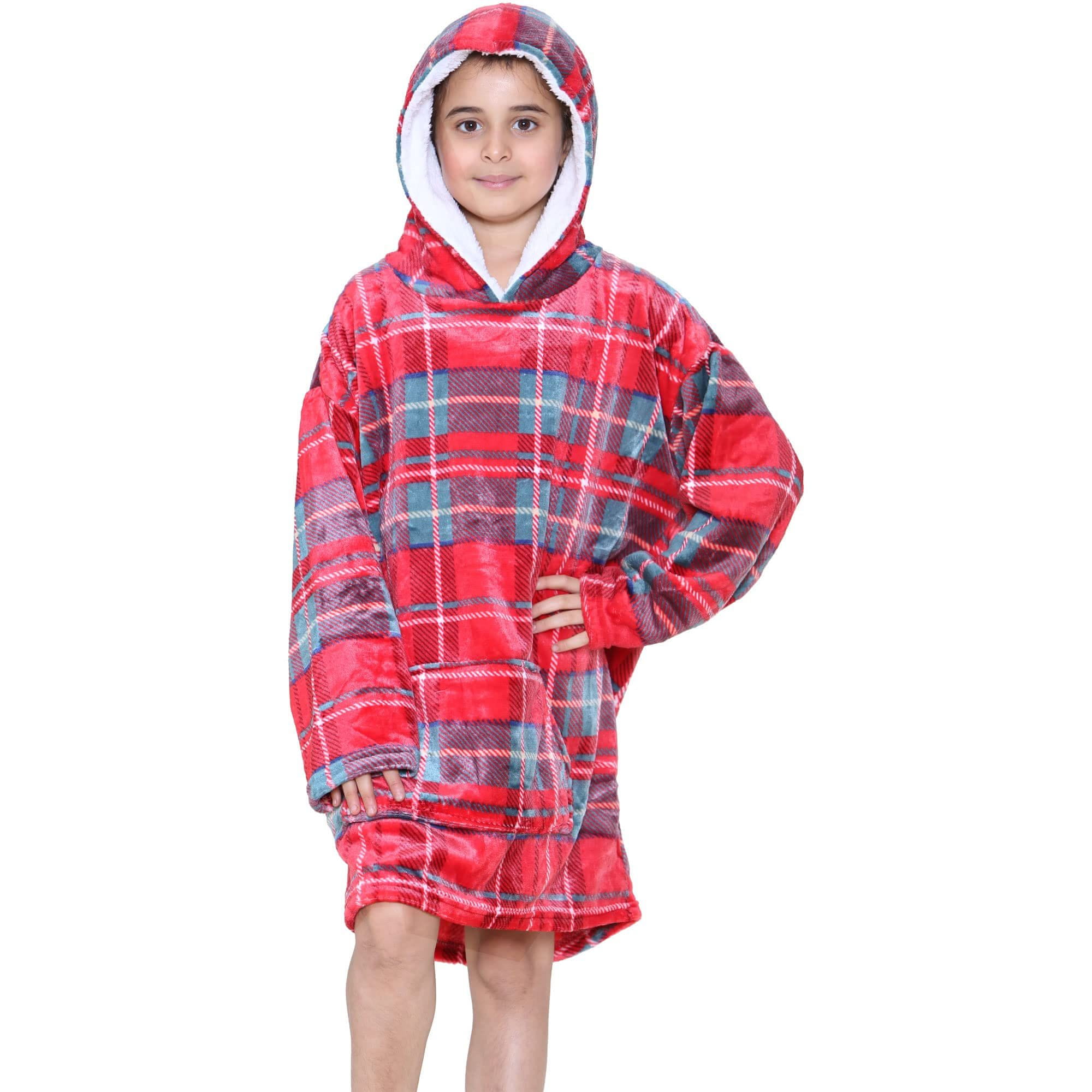 Nikcorp Deka majica s kapuljačom za djecu, oversize model od mekanog flisa, topla 2u1 dječja dekica s rukavima, crveni karirani uzorak