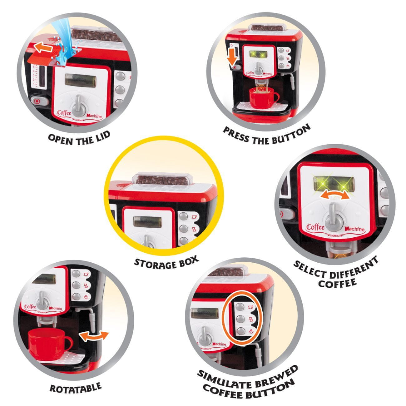 Mališani vole oponašati mame i tate a ovim aparatom za kavu koji svjetlosnim i zvučnim efektima pruža autentično iskustvo kuhanja kave, mališani se mogu uživiti u ulogu odraslih i pripremiti imaginarne kavice za prijatelje, mamu i tatu ili pak za plišanog medu. Jednostavan je za korištenje. Sve što treba je uliti vodu u spremnik, postaviti šalicu i pritiskom na tipku dozirati vodu – kavu u šalicu. Tko je za kavicu?