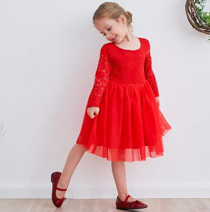 Nikcorp Svečana haljina za djevojčice od tila i čipke s dugim rukavima, crvena tutu haljina s pamučnom podstavom, veličina 100 cm