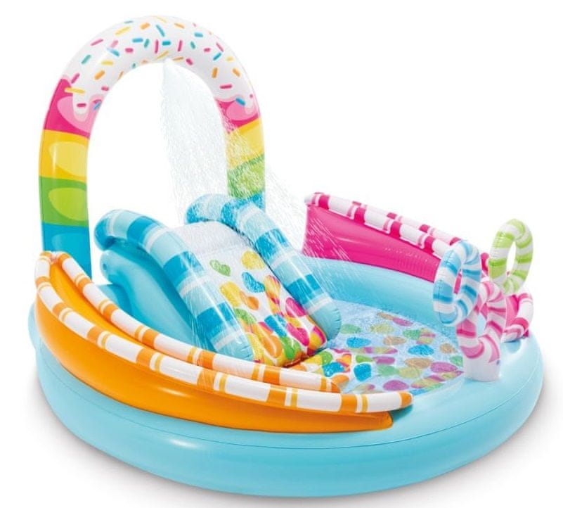 Zabavni Candy Play Center u obliku slatkiša ima tobogan, bazen i vodeni tuš. Moći ćete se zabaviti i osvježiti u vrućim ljetnim danima. Napuhajte i uživajte u ljetu punom osvježenja.