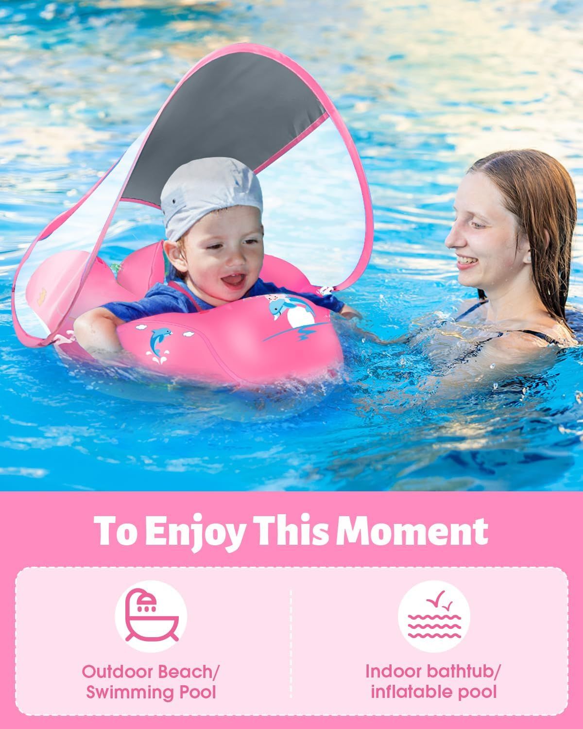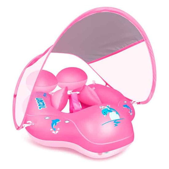Netscroll Dječji plivački obruč s krovićem, napuhljiv za bebe i malu djecu, sigurnosni rep protiv prevrtanja, UPF50+ zaštita, dvostruka zračna komora; FloatyBaby, roza