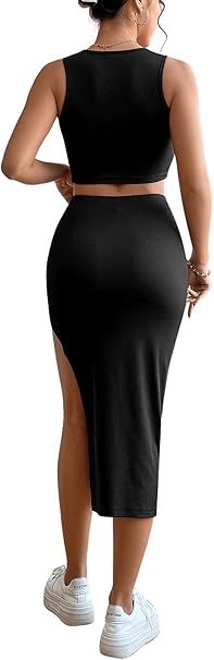 Nikcorp Ženski komplet crop top majica i midi suknja s prorezom, elegantni dvodijelni set za zabave, rastezljiva tkanina, crna, S