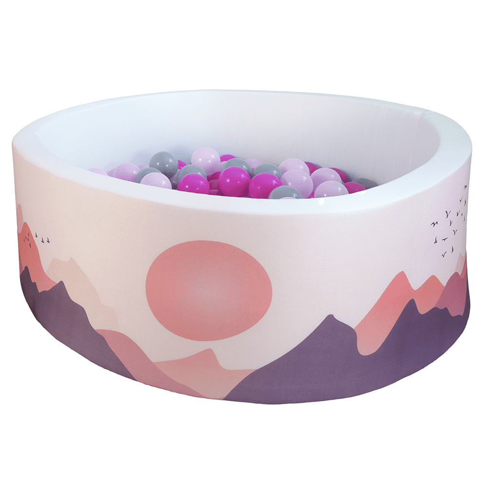 Imate li kod kuće malu princezu kojoj savršeno pristaje soba u nijansama ružičaste? Naš suhi bazen s motivom planinskog krajolika i jata ptica u tonovima ružičaste i ljubičaste boje savršen je dodatak za sobe malih princeza. Elegantnog, modernog i jednostavnog dizajna koji unosi nježnost i stil u svaki prostor. Bazen je prikladan za djecu od 1 godine starosti.