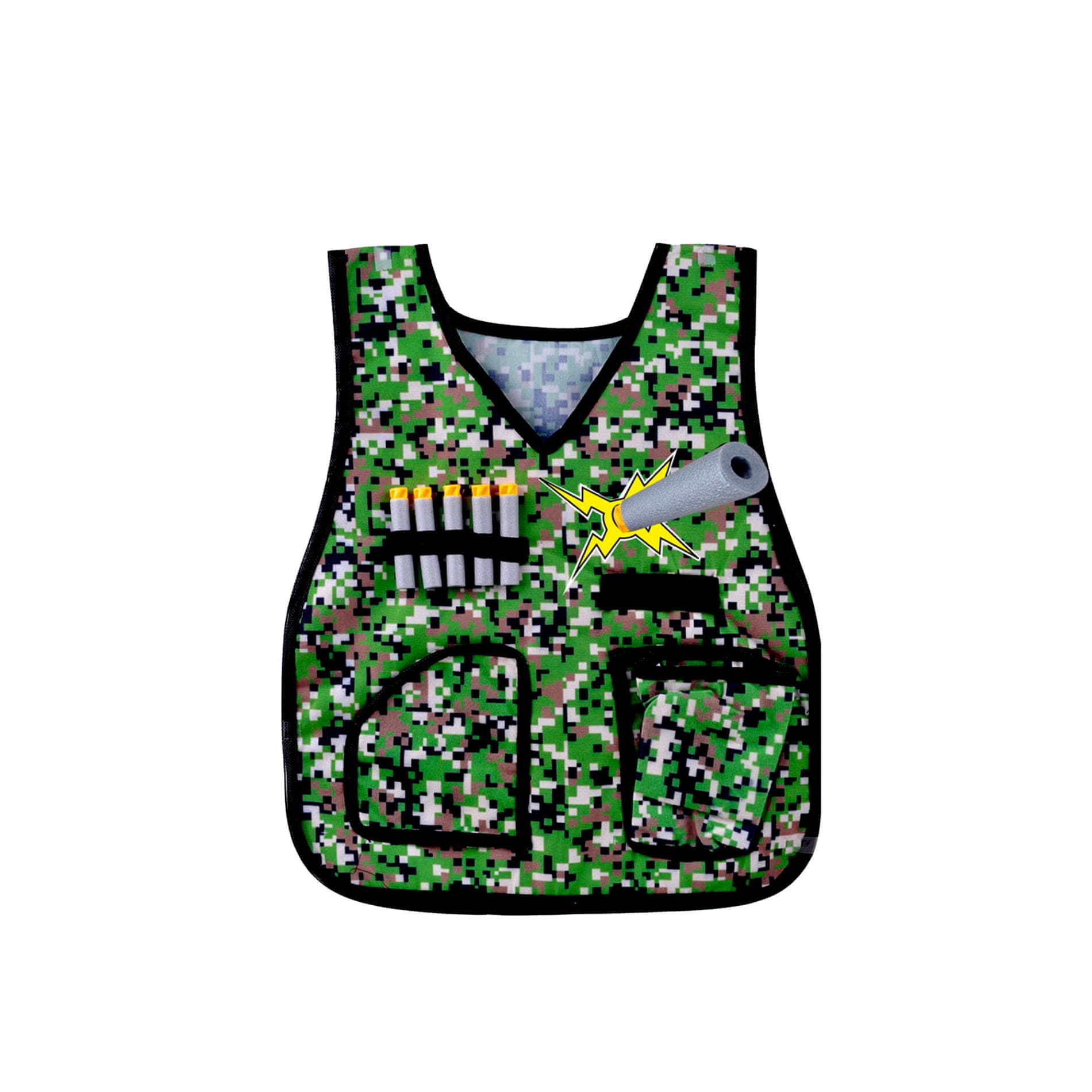 Taktički prsluk je neizostavan dio svakog malog vojnika na bojištu. Zahvaljujući njoj uvijek ćete imati zalihu streljiva za oružje.Još jedan element seta je maska, zahvaljujući kojoj će vaše dijete izgledati kao pravi ratnik.