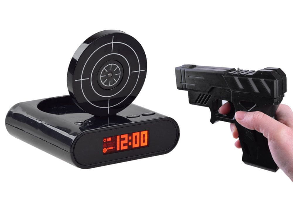 Zato je budilica s oružjem pravi hit. Dovoljno je uperiti pištolj u metu i budilica nas prestaje buditi!