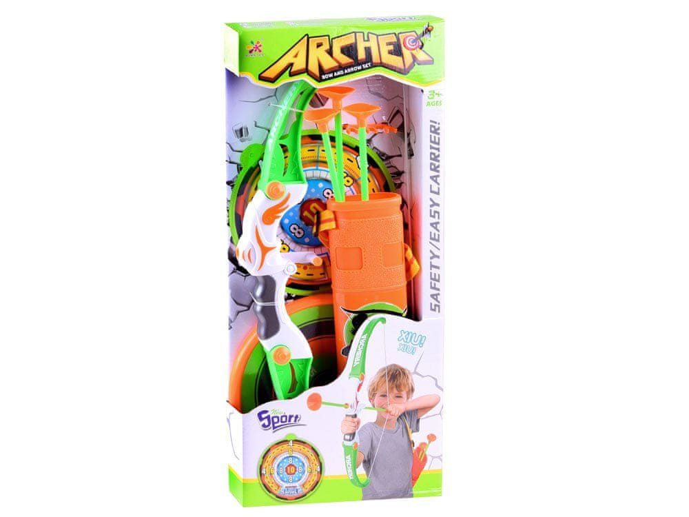 Sjajan set za svu djecu koja vole pucati. S njim se naše dijete može sigurno igrati viteza ili Indijanca. Zanimljive boje i estetska obrada zasigurno će potaknuti svako dijete na igru. Svaka strelica završava gumenom usisnom čašicom – igra će biti sigurna.