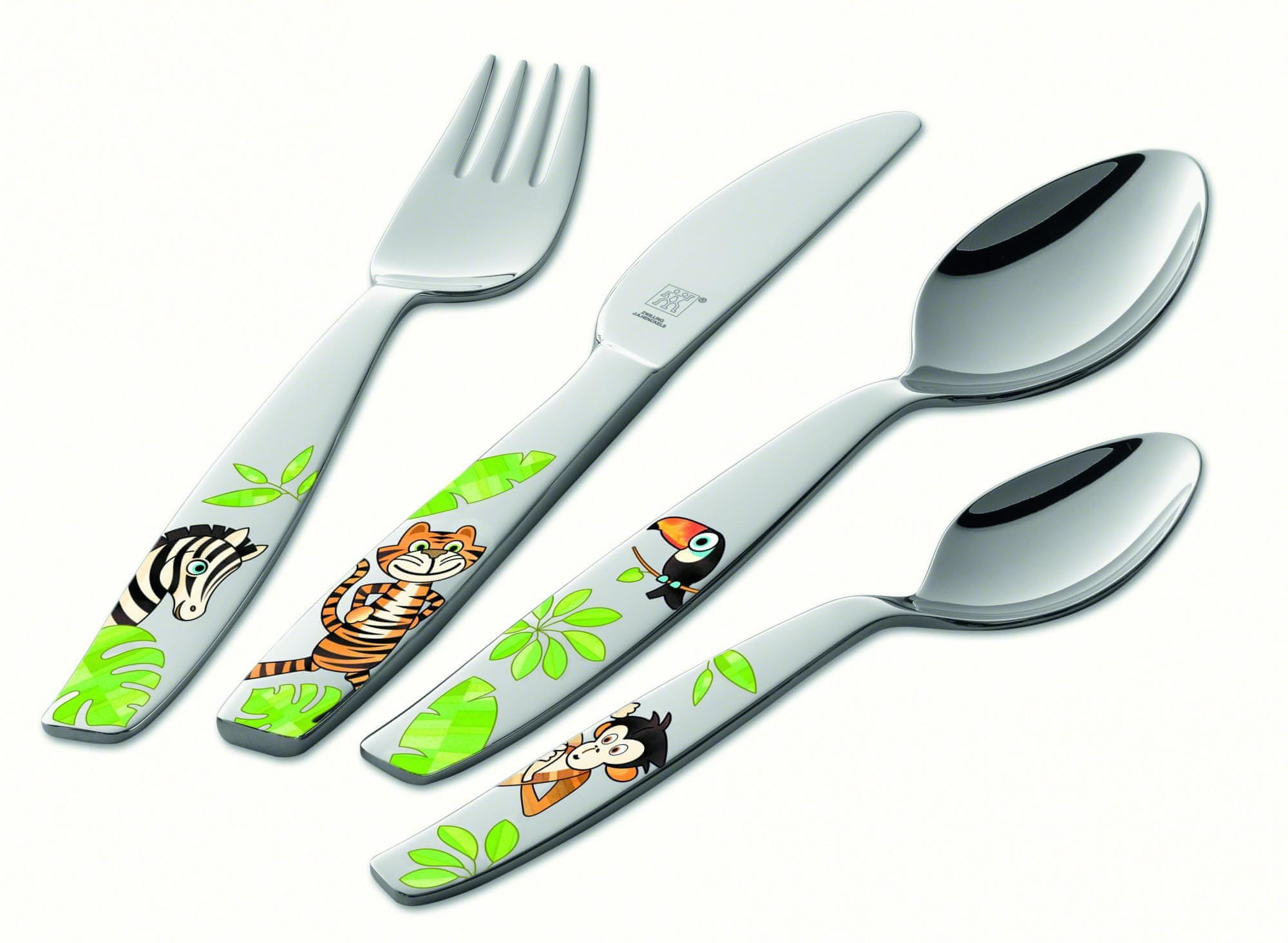 Dječji pribor za jelo je ukrašen sa simpatičnim motivima životinja kao što su slon, žirafa, lav i majmun.