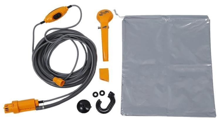 - UČINKOVITA PUMPA – u tušu je korištena pumpa visokog učinka 3,5 l / min. Dovoljno je priključiti kabel u auto utičnicu. Ima također sposobnost očistiti i zamijeniti filter, dovoljno je odvrnuti vrh. Redovito čišćenje filtra održat će ga u dobrom stanju i produžiti mu vijek trajanja. Filter sprječava ulazak nečistoća i održava vodu čistom. Pumpa ima hermetički zatvoren prekidač ON / OFF, koji sprječava ulazak vode koja bi mogla uzrokovati oštećenje.