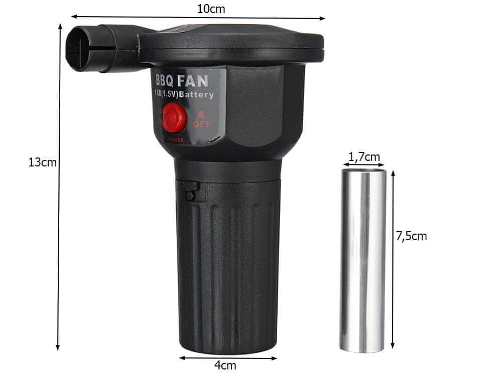 Uređaj radi na baterije, samo uključite gumb i zrak počne letjeti i rasplamsati žeravicu. Mala veličina omogućit će vam da ga ponesete na odmor, kampiranje, pod šator. Cijev se može ukloniti tijekom skladištenja.