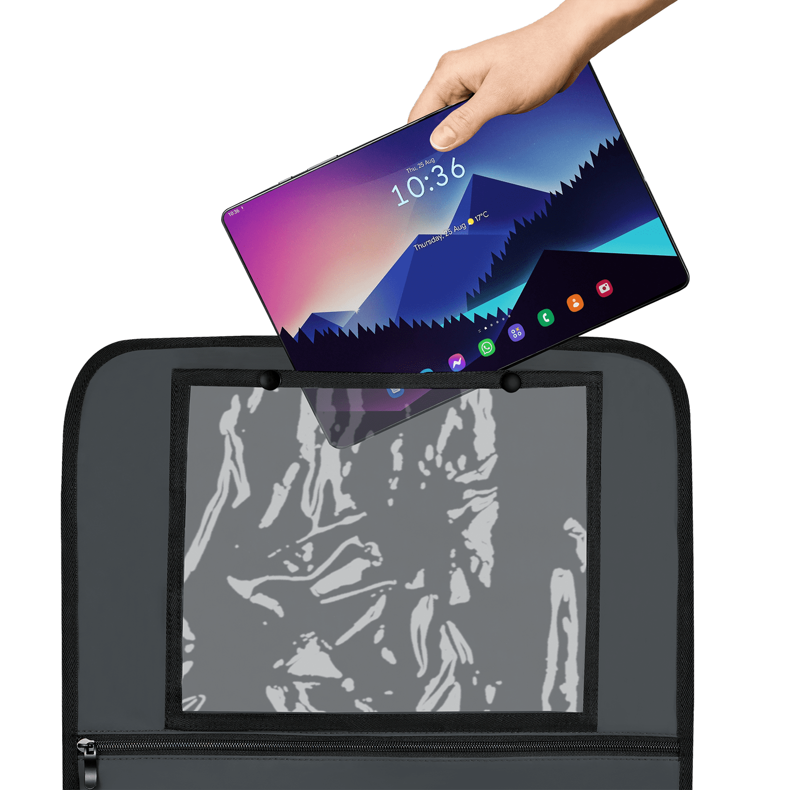 Vodootporna eko koža Zašto ga roditelji vole? – Povećava sigurnost – štiti putnike od nekontroliranog udara u neučvršćene predmete tijekom naglog kočenja ili nezgode. – Pomaže u održavanju reda i privlači pozornost djeteta tijekom vožnje. 5 džepova s različitim namjenama Veliki džep s patentnim zatvaračem, 2 manja džepa za boce ili grickalice, mali praktični džep i džep za tablet pomažu da vaš automobil bude organiziran i da vam sve bude pri ruci. Džep za tablet (do 13'') Zaštićeni džep s prozirnim prozorom koji vam omogućuje upravljanje zaslonom osjetljivim na dodir najprikladniji je način da zadržite zanimanje vašeg djeteta dok je u pokretu, npr. prikazivanjem bajki. Dijete može pristupiti uređaju, ali ga neće zaprljati. Čvrsta, izdržljiva i laka za čišćenje Visokokvalitetna eko koža s vodootpornim svojstvima štiti sjedalo od vlage i prljavštine, a čišćenje rokovnika je vrlo jednostavno – samo ga obrišite vlažnom