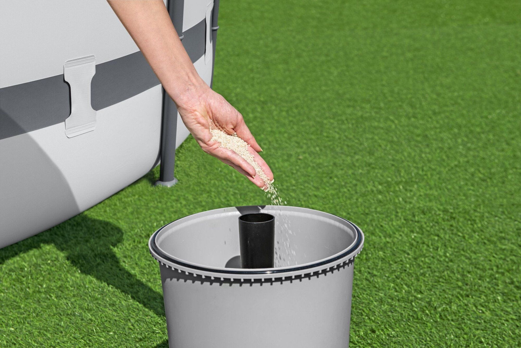 Preporučljivo je isprati pijesak s vremena na vrijeme čistom vodom ili ga zamijeniti, posebno prilikom čišćenja oblačne vode u bazenu. Filtracija je lako povezana s pripremljenim prodajnim mjestima na stranama bazena.