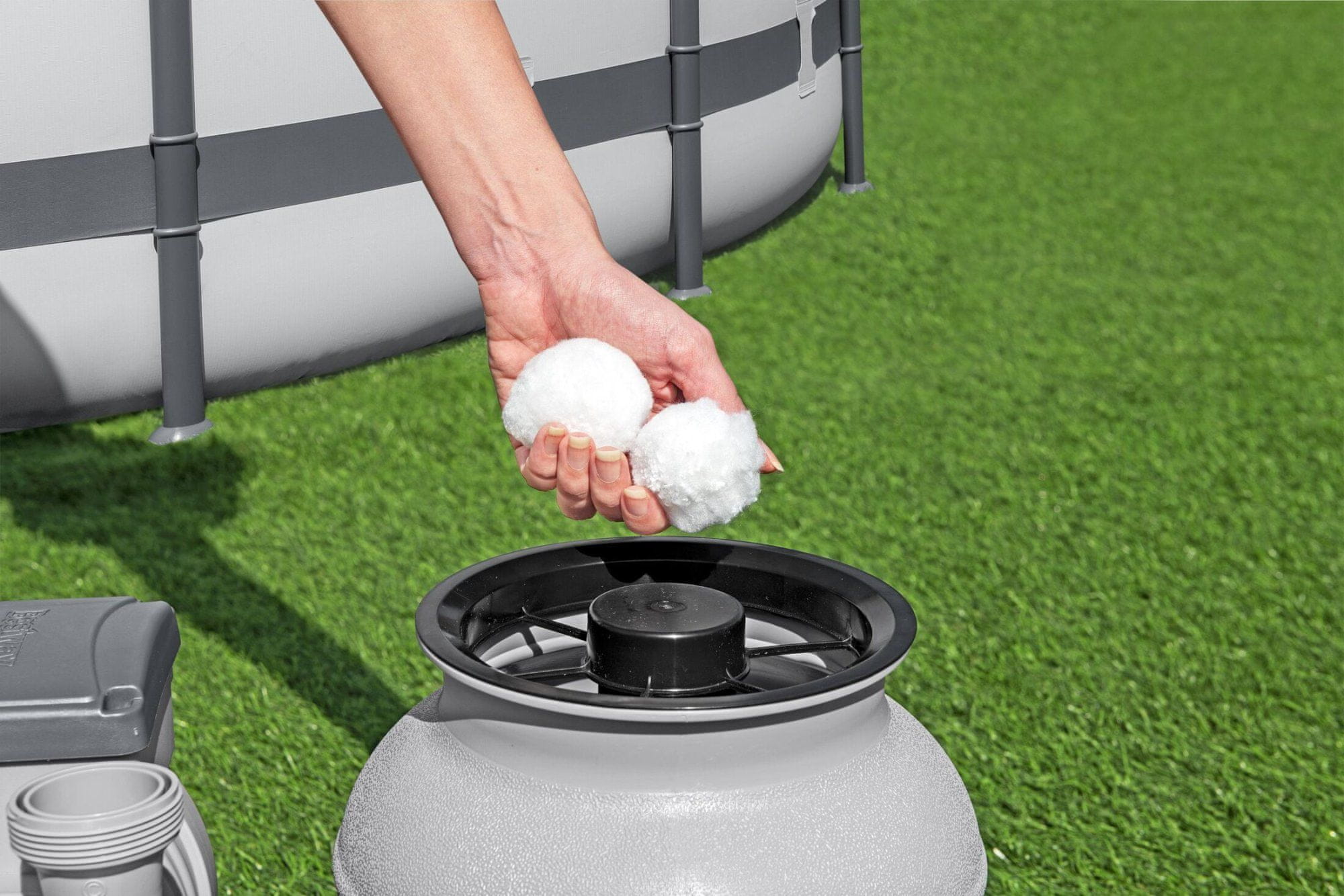 Filtracija pijeska za bazene učinkovito je rješenje za bazene promjera od 457 cm i visine do 122 cm. Filtracija djeluje na standardnom napajanju od 230 V i dostiže protok vode od 5687 litara na sat. Ova metoda filtracije značajno je učinkovitija od papirnih filtera, jer je dugo uhvatila mehaničke nečistoće u vodi. Za svoj rad potrebno je koristiti silicijev pijesak, koji nije uključen, ali je obično dostupan u građevinskim materijalima. Za optimalnu funkciju potrebno je otprilike 9 kg pijeska s preporučenom veličinom zrna od 0,45 – 0,85 mm. Za održavanje čistoće, redovito ispiranje pijeska čistom vodom ili zamjenom, posebno prilikom čišćenja oblačne vode u bazenu. Sustav filtra može se lako povezati sa standardnim utičnicama na stranama bazena.