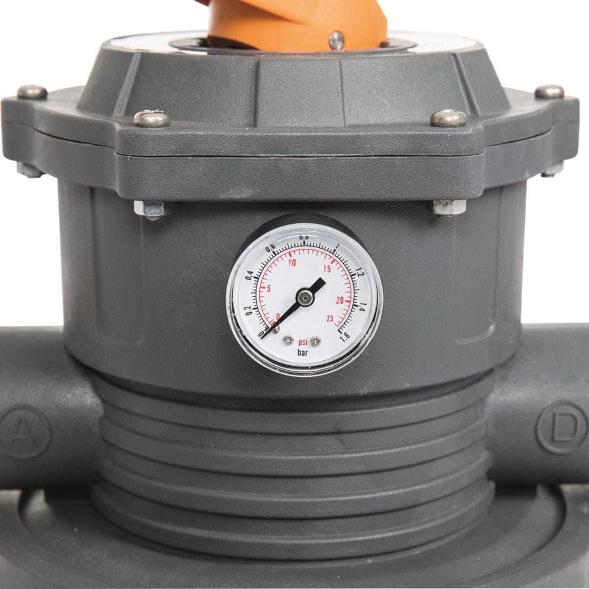 Filtracija bazenskog pijeska za velike nadzemne bazene s protokom od 8327 litara na sat. Šestoputni ventil za jednostavno podešavanje optimalne filtracije. timer za podešavanje radnog ciklusa filtracije Preporuča se za bazene zapremine do 54.500 litara. Tehnički podaci: