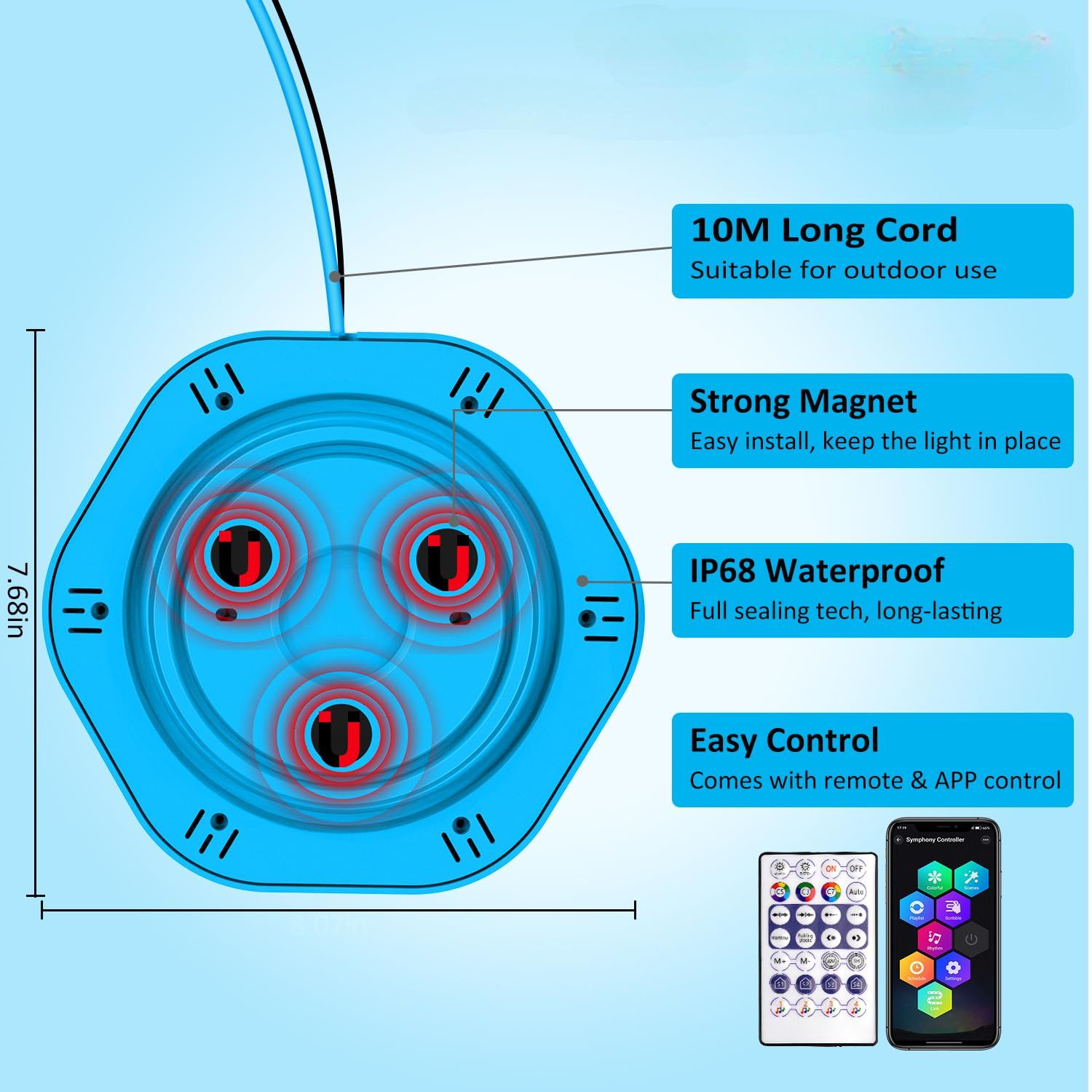 Nikcorp LED RGB rasvjeta za bazen 18W, IP68 vodootporna, magnetna montaža, Bluetooth aplikacija, daljinski upravljač i kabel 10m