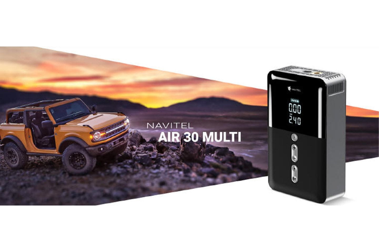NAVITEL AIR 30 MULTI je elegantan prijenosni bežični kompresor zraka s automatskim regulatorom tlaka, digitalnim manometrom i LCD ekranom. Riječ je o višenamjenskom uređaju, koji može puniti gume, puniti mobilne uređaje pa čak i upaliti automobile s praznim akumulatorima. Zahvaljujući ugrađenoj punjivoj bateriji volumena 10000 mAh, guralica radi potpuno bežično i bez spajanja na električnu utičnicu ili mrežu u vozilu.