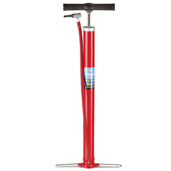 Crvena ručna pumpa s metalnim kućištem. Cijeli opis