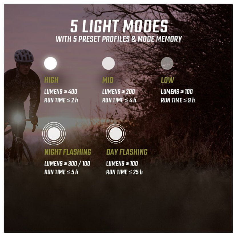 - 5 načina osvjetljenja: Visoki (400 lm), srednji (200 lm), niski(100 lm), noćni bljesak (300/100 lm), dnevni bljesak (100 lm)