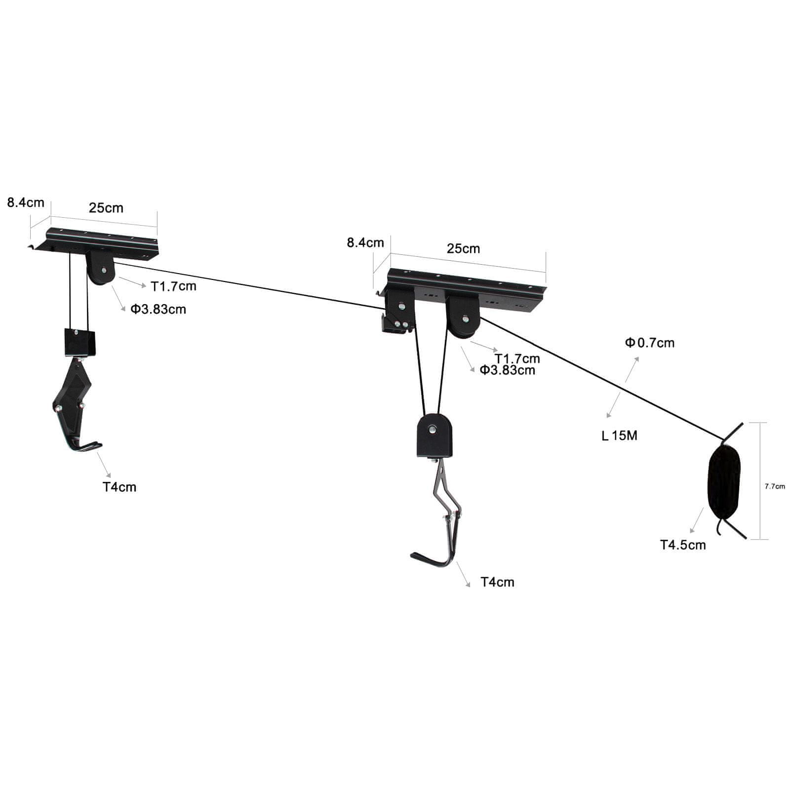 Maksimalna nosivost20 kgIIIIIIstropne grede ukupno: 84 × 250 mm kotači: Ø 38 mm x 17 mm nosač kuke: zidni nosač od 40 mm ukupno: 77 × 45 mm duljina užeta: 15 m Promjer užeta: 7 mmTežina u kg1.41MaterijalMetal / plastikaUpotreba / informacije / funkcijeDizalice za bicikle za sve veličine bicikala Gumene kuke za pričvršćivanje Maks. Visina stropa 4mDodaciuklj. Materijal za montažu