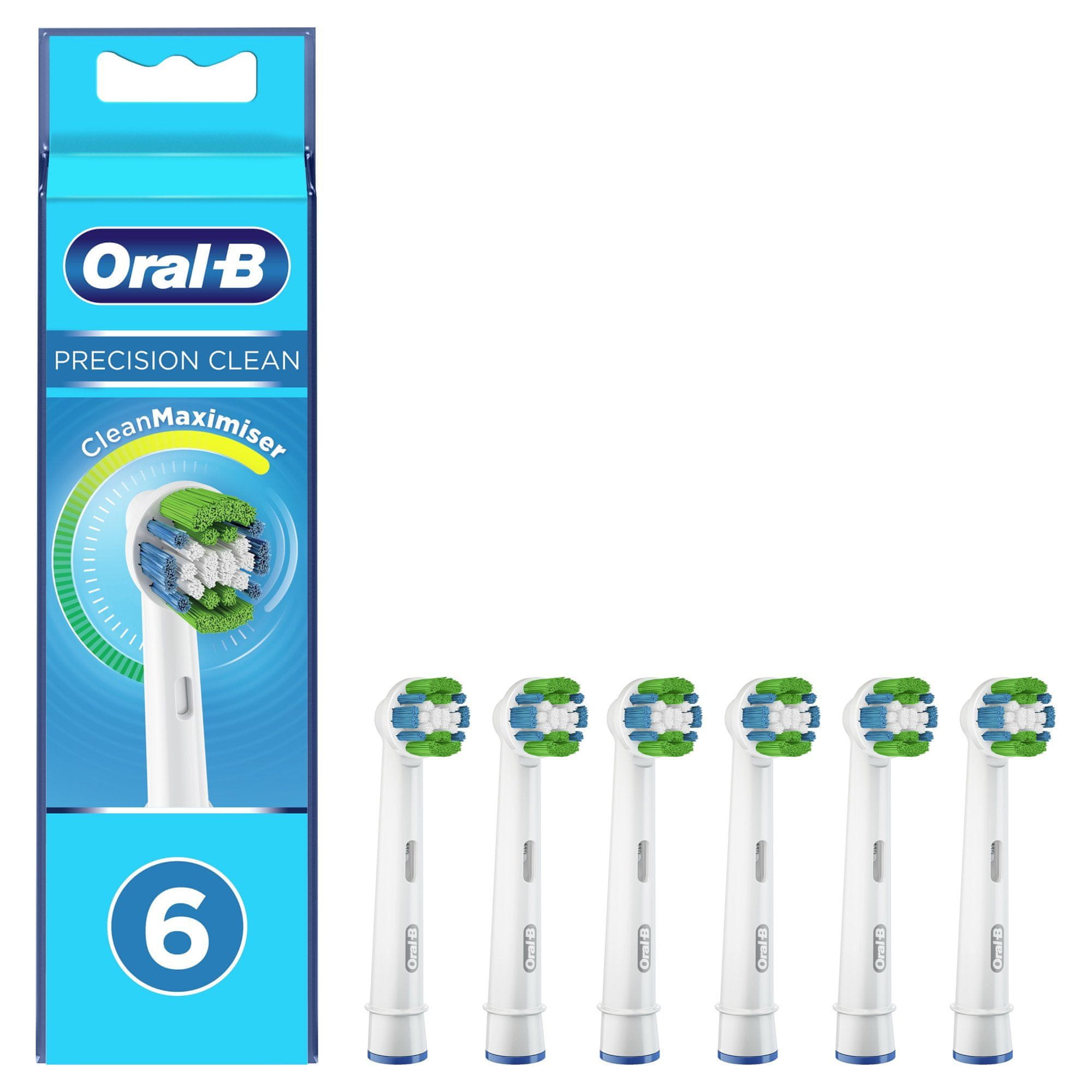 Zamjenska glava četke sa nagnutim čekinjama od 16 stupnjeva koje uklanjaju do 100% više naslaga od ručne četke. Oral-B Precision Clean glava četke s tehnologijom CleanMaximiser, 6 komada ima tehnologiju CleanMaximiser, pa zelene čekinje postaju žute, što pomaže u osiguranju optimalnog rada glave četke. Kompatibilan sa svim električnim četkama Oral-B osim modela Pulsonic & iO.