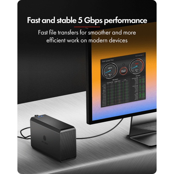 IB-RD3720-CU3 je dvostruki RAID sustav, dizajniran za pouzdano i proširivo pohranjivanje podataka korištenjem dva 2.5" ili 3.5" SATA pogona. Ukupna podrška do 60 TB omogućava dovoljno prostora za opsežne sigurnosne kopije, produkcijske datoteke, multimedijske zbirke ili druge projekte koji zahtijevaju puno podataka. Napredni RAID načini, koje jednostavno podešavate putem DIP prekidača, omogućuju odabir između veće brzine (RAID 0), redundancije (RAID 1) ili fleksibilnih kapaciteta (SINGLE, LARGE). Za pouzdano djelovanje pri dugim opterećenjima ugrađen je 50 × 50 mm ventilator, koji održava optimalnu temperaturu diskova i time produžava njihovu životnu dob. USB-C 3.2 Gen 1 veza omogućuje prijenose do 5 Gbit/s, što osigurava brzo i stabilno rukovanje velikim datotekama.