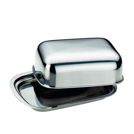 Posuda za maslac od nehrđajućeg čelika s udubljenjem koje sprječava klizanje maslaca preko ruba.