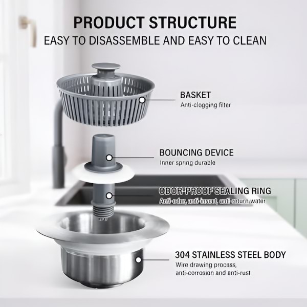 Ovo sveobuhvatno rješenje djeluje kao cjedilo, čep i filter za mirise, održavajući vaš sudoper čistim, suhim i bez mirisa.