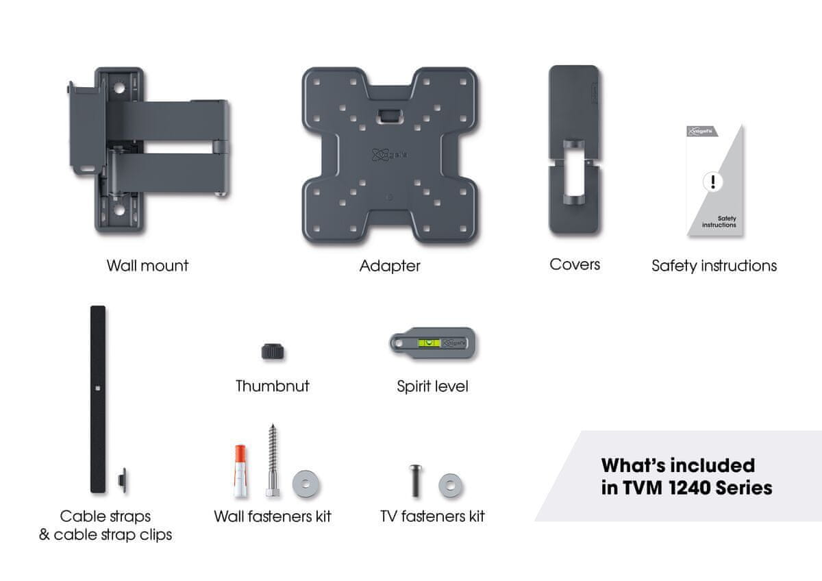 Vaš zidni nosač za TV QUICK Full Motion+ dolazi sa svim potrebnim materijalima za montažu: šablonom za bušenje, vijcima i Fischer® DuoPower utikačima. Uključena je i libela, kao i kabelske vezice za čvrsto i sigurno povezivanje kabela. Naša besplatna aplikacija DrillRight™ AR olakšava označavanje prve rupe za bušenje, a Vodič za brzu instalaciju pokazuje vam kako sve instalirati korak po korak. Također možete pogledati detaljni priručnik i video za instalaciju online.