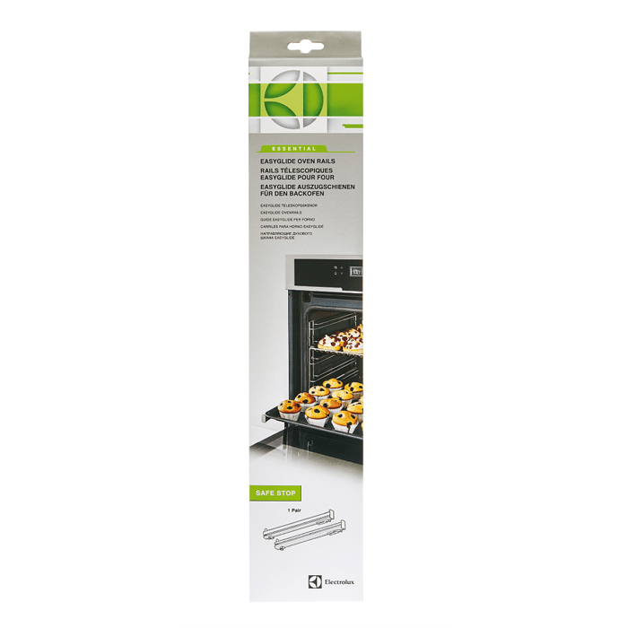 S otpornim i samozadjelim jednostrukim vodilicama na izvlačenje marke Electrolux, provjerite pripravljenost vaše hrane. Jednostavan za instalaciju, jednostavan za pričvršćivanje s postojećim držalima sa strane. Tehnologija SafeStop sprječava klizanje i pomicanje vodilica naprijed. Teleskopske vodilice su pogodni za sve Electroluxove XXL i kompaktne pećnice.