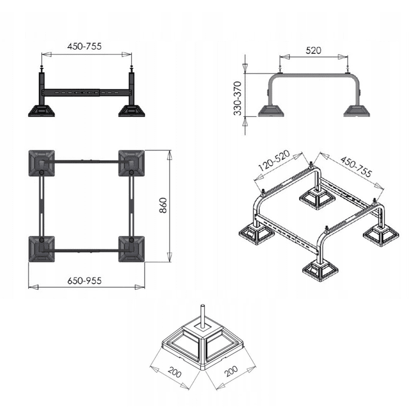 Podnožje za klime in toplotne črpalke FrameFoot FF-755 – robustna samostojeća konstrukcija za učinkovitu montažu sustava toplinskih pumpi i klima uređaja postavljenih na podne površine ili ravne krovove s maksimalnim nagibom do 5%.