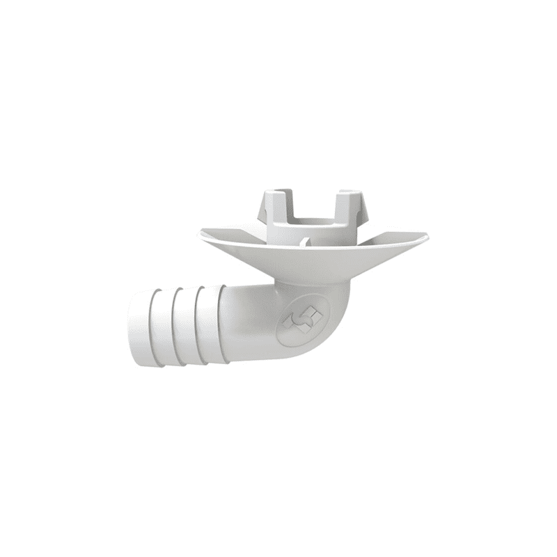 Plastična univerzalna pipeta za odvod kondenzata iz vanjske jedinice klima uređaja s otvorom dimenzije 19 mm, dok je dimenzija priključka za odvodno crijevo 20 mm.
